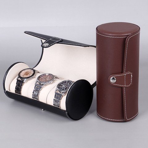 Taşınabilir seyahat 3-Digit silindirik PU deri saat saklama kutusu erkekler ve kadın takı ve hediyeler için yumuşak yastıklar ile